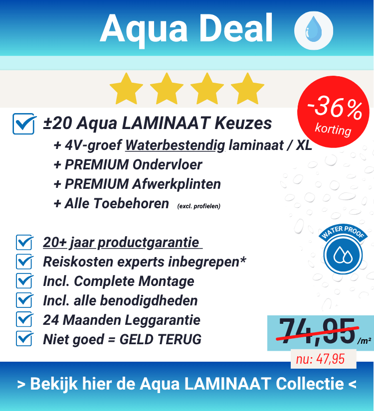 Het Premium laminaat deal pakket bevat de ruimste keuze aan laminaat. Bij deze deal krijg je hoge kwaliteit laminaat voor een lage all-in prijs van €34,95 p/m². Vul hieronder ons offerte aanvraagformulier zo volledig mogelijk in. Wij beloven dat je binnen 1 werkdag een offerte in je mailbox zult aantreffen.