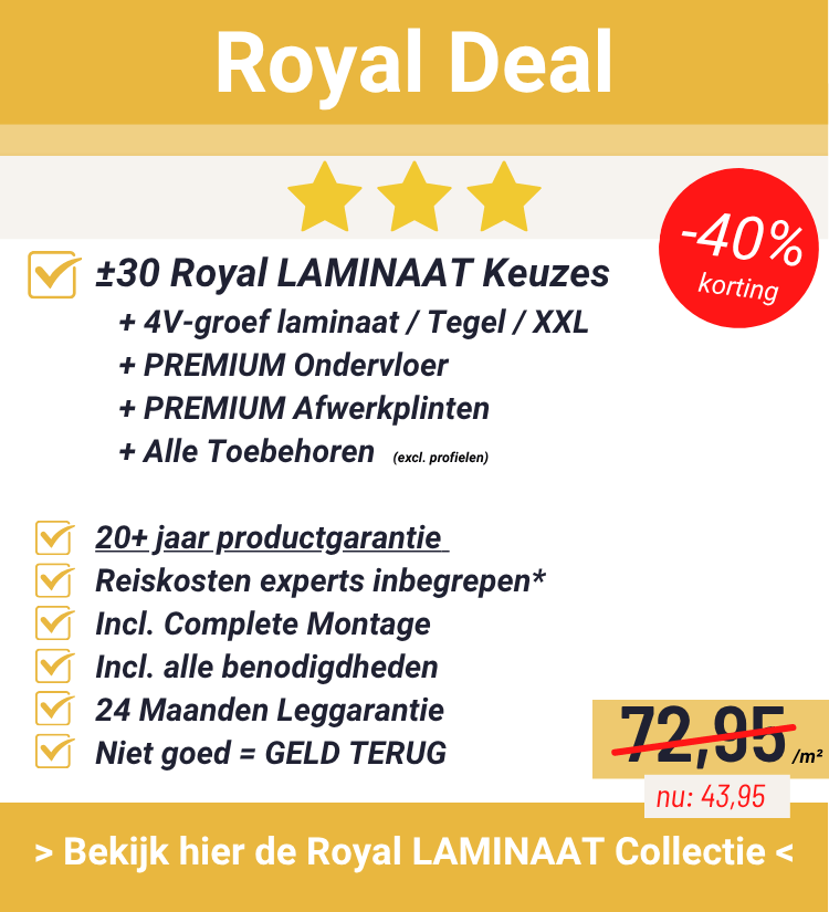 De laminaat-inclusief-leggen Royal Deal is dé deal voor laminaat van de bovenste plank.